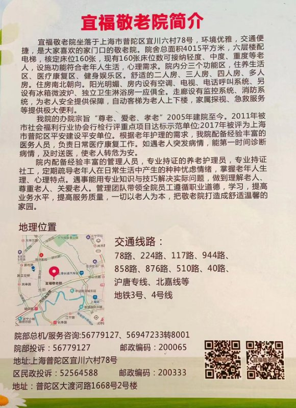 ☐ 基础概况:上海普陀区宜福敬老院成立于2005年3月23日,运营经验丰富、口碑良好,拥有160多张床位,2011年获评市社会福利行业协会重点项目达标示范单位,2017年荣获普陀区平安建设平安单位称号,以规范管理、优质服务赢得行业与家属认可,专注为长者提供全方位生活照料与护理服务。