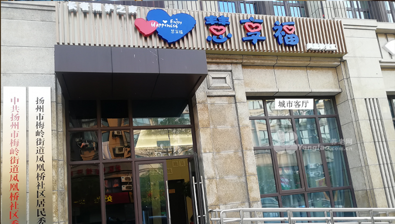 扬州慧享福长者照护之家凤凰桥店,位于老虎山西路27号(凤凰桥社区二楼),东邻便益门广场、南邻东关街,西邻宋夹城和瘦西湖风景名胜区,北邻御龙湾商业广场,大润发和吾悦广场;建筑共四层,凤凰桥门店位于建筑二楼,总建筑面积1139㎡,共设床位61张,房间设置上有单间、二人间及三人间;机构内部功能分为、接待厅、多功能餐厅暨活动区、康复训练区、多媒体活动区、综合照护工作室、助浴区、城市客厅、多功能阅读休闲区、托养住宿区、厨房区等多个功能区域。截至目前,机构入住长者共30余位,以半自理老人居多,入住老人平均年龄83岁。